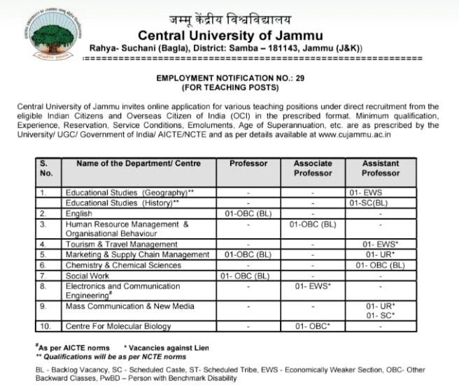 The Central University of Jammu (CUJ) has released employment notification, inviting applications from eligible Indian citizens and Overseas Citizens of India (OCI) for various teaching positions. The recruitment drive aims to fill faculty vacancies across several specialized departments. CUJ is looking to fill 13 positions which includes three vacancies of professor, three vacancies of associate professor and 7 vacancies of assistant professors in different department.