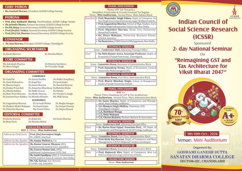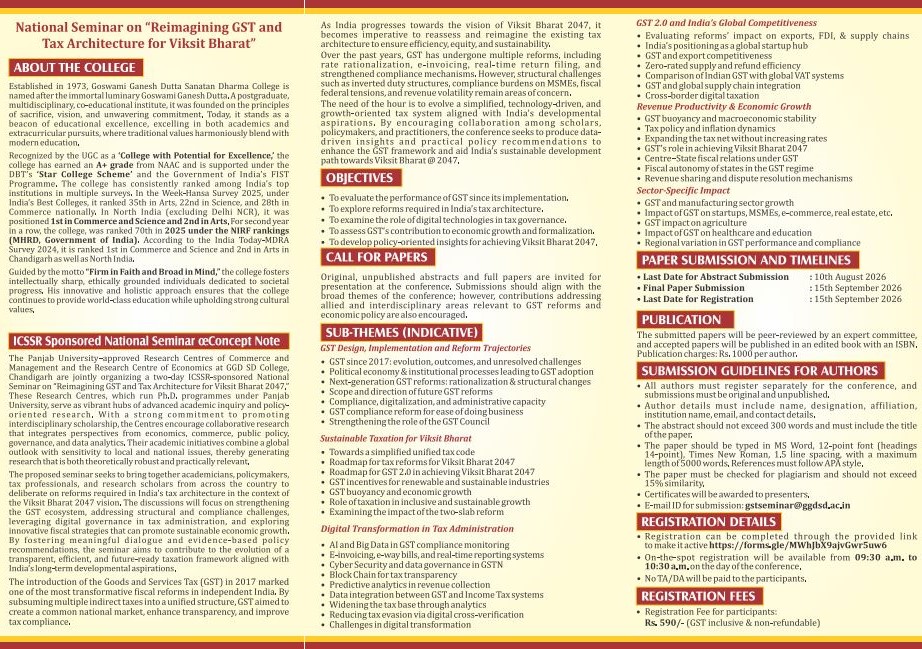 Goswami Ganesh Dutta Sanatan Dharma College, Chandigarh, is organizing two-day national seminar on “Reimagining GST and Tax Architecture for Viksit Bharat 2027.” The seminar is sponsored by Indian Council of Social Science Research (ICSSR).